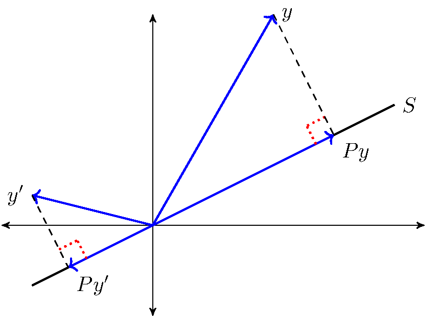 To this end, let \(y \in \mathbb R^n\) and let \(S\) be a linear subspace of \(\mathbb R^n\).